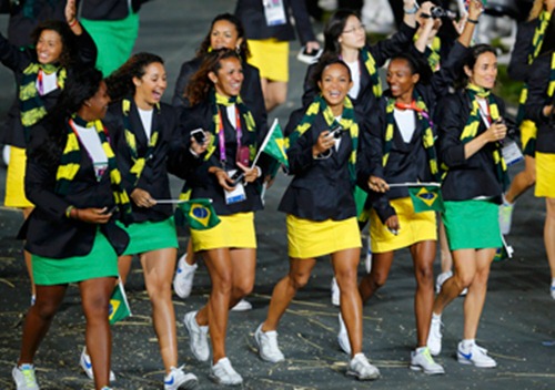 Os brasileiros vestiam uniformes sóbrios no corte e atrevidos nas cores, usando a gama cromática da bandeira brasileira, com modelos da estilista Eliza Conde.